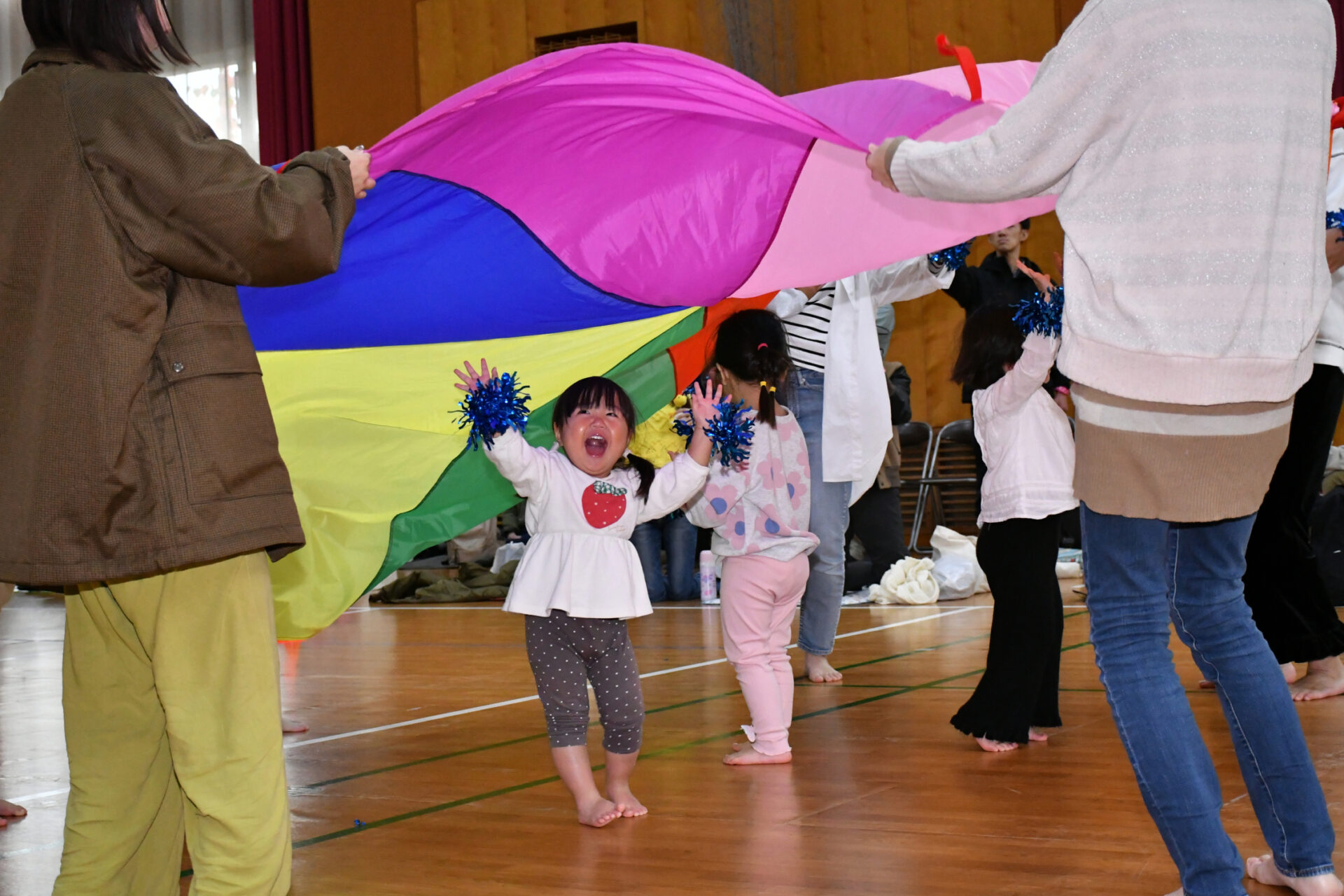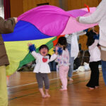わらべうた・体操、月1で楽しんでいるリトミックでおこなったパラバルーンも保護者様と行いました